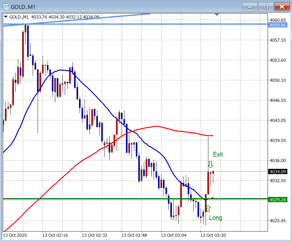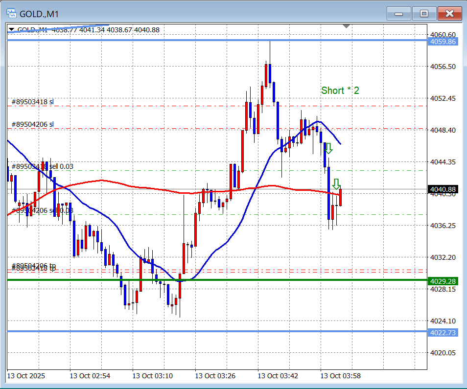 そして、水平線ですぐさま反発して下にある1時間足レベル水平線(緑色、4029.28)まで降りてきていました。