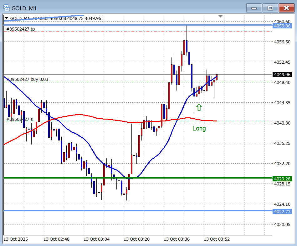 この1時間足レベル水平線で反発するならロングを打てますし(底ロング)、少し下の4時間足レベル水平線(水色、4022.73)まで降りるなら、そのあたりでロングを打つつもりでした。